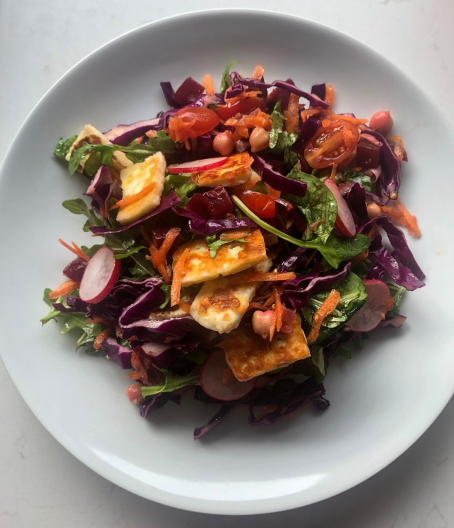 I first made this salad a couple of months ago, after having lunch at a cafe while waiting for my dog to finish up at his grooming appointment.* It’s rare that I order a salad when I eat out, as I generally like to try things I wouldn’t normally make myself. But the sound of the salad on this particular menu was so enticing I had to order it. It was probably the inclusion of haloumi that sold it to me, to be honest (I am not normally a cheese fan, but I make an exception for halloumi). And it was delightful. I loved this salad so much, that as I was eating it I picked it apart, typed the ingredients into the Notes app on my phone, and recreated it the next day.